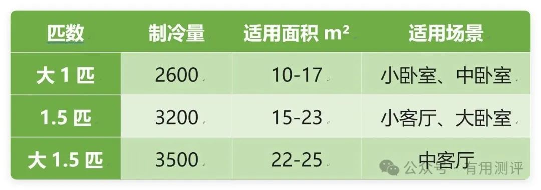 目前主推的是大1.5匹空调,但是实际很多房间用不到这么大的匹数,制冷效果太好不适用于小房间。匹数和房间面积不匹配的话,反而很容易出现反作用——能耗升高。这里给大家一个表格(局限于挂机,柜机另出),在选购的时候可以参考一下。